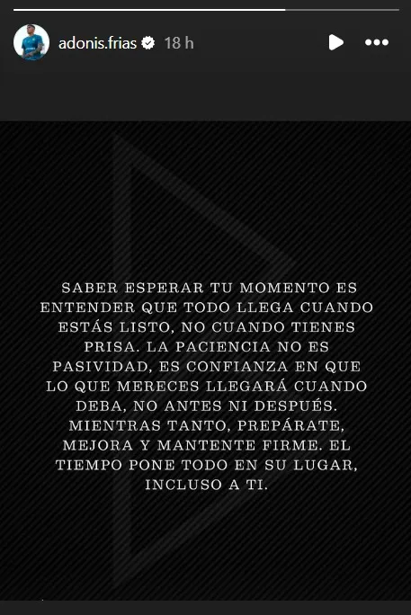 Este martes, el jugador subió una curiosa historia en Instagram, donde compartió un recitado relacionado a “esperar el momento”. Esto se puede entender, que Frías todavía sigue con ganas de jugar en Boca, sólo que todavía “no llegó ese momento”.