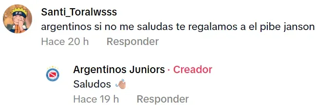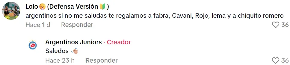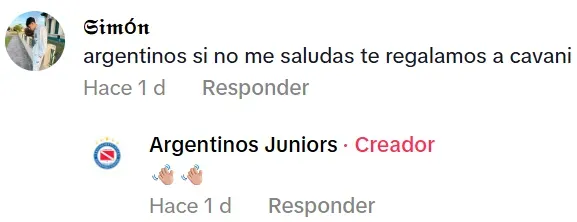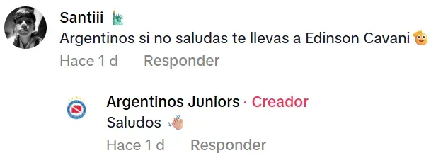 Y es que en redes, el “Bicho” subió un video en redes sobre Alan Lescano, quien estuvo en la órbita del Único Grande en el pasado. Pero en los comentarios, algunos exigieron saludos, con una curiosa propuesta. “Argentinos, si no me saludás te regalamos a Cavani“, “Si no saludás te llevás a Edinson Cavani” . El administrador de la cuenta oficial del equipo de La Paternal no tardó en reaccionar y empezó a responder cada comentario con un saludo, o el emoji de una mano saludando.