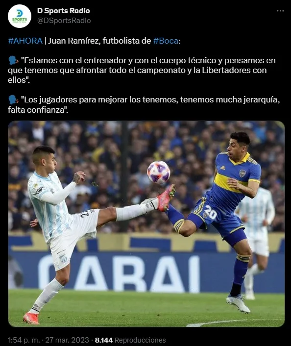 Ramírez aportó tranquilidad y marcó su postura sobre la situación del DT. “Se dicen muchas cosas, pero nosotros pensamos en hacer lo mejor para el club. Estamos con el entrenador y con el cuerpo técnico y pensamos en que tenemos que afrontar todo el campeonato y la Libertadores con ellos. Tenemos la jerarquía necesaria, tal vez nos falta un poco de confianza”, sostuvo.