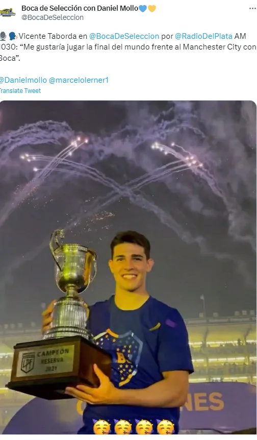 Y siguió: “Entre la Bombonera que gana partidos, el plantel y los refuerzos que llegarán, Boca es favorito a ganar la Copa Libertadores. Sin dudas me ilusiona jugarla con Boca el semestre que viene”. Pero, además, Taborda se animó a soñar: “Me gustaría jugar la final del mundo frente al Manchester City con Boca”.