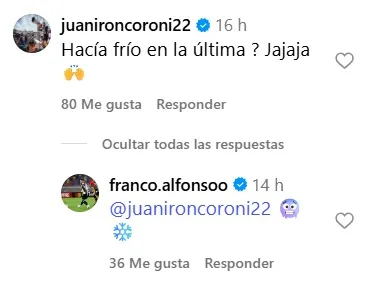 Contra el Xeneize en La Bombonera, el atacante de jugó tan solo 16 minutos. Y después del empate, subió un posteo a sus redes con una burla para Boca. La cual a su vez, estuvo acompañada de un comentario de un fotógrafo de Huracán: “Hacía frío en la última” (foto). A lo que el suplente respondió con un emoji de “frío”.