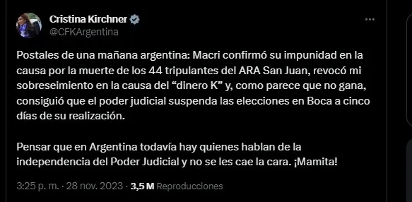 Cabe recordar que esta no es la primera vez que la política se encuentra atravesada en las elecciones de Boca. Anteriormente quien se pronunció al respecto fue nada menos que Cristina Kirchner, ex presidente de la Nación, la cual también arremetió contra Mauricio Macri: “Macri confirmó su impunidad en la causa por la muerte de los 44 tripulantes del ARA San Juan, revocó mi sobreseimiento en la causa del “dinero K” y, como parece que no gana, consiguió que el poder judicial suspenda las elecciones en Boca a cinco días de su realización“.