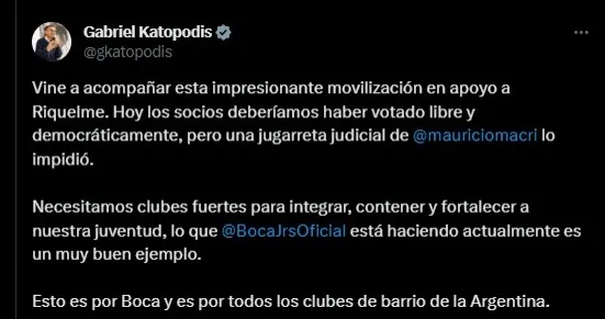 Como era de esperarse, el acto estuvo plagado de fanáticos azul y oro y uno de estos tantos llamó poderosamente la atención: Gabriel Katopodis, Ministro de Obras Públicas de la Nación. De esta manera, el político se hizo presente en apoyo del candidato a presidente a Boca y posteriormente le dedicó unas palabras en sus redes sociales no solo a él, sino al candidato a vicepresidente opositor: “Hoy los socios deberíamos haber votado libre y democráticamente, pero una jugarreta judicial de Mauricio Macri lo impidió“.
