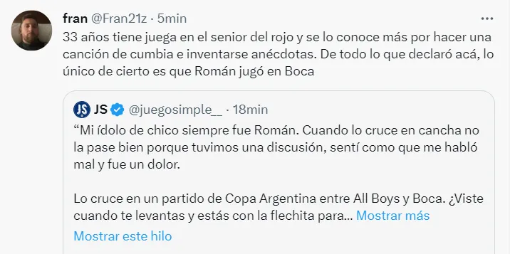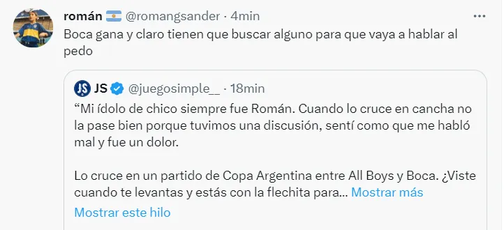“Mi ídolo de chico siempre fue Román. Cuando lo cruce en cancha no la pase bien porque tuvimos una discusión, sentí como que me habló mal y fue un dolor. Lo cruce en un partido de Copa Argentina entre All Boys y Boca. ¿Viste cuando te levantas y estás con la flechita para arriba? Me salían todas. Metí el tercero, me eligieron mejor jugador del partido, todo. Eliminamos al Boca de Bianchi y de Román. Un Boca increíble”, soltó.