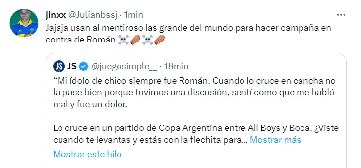 Minutos después, los bosteros le salieron al cruce y lo liquidaron a través de las redes sociales, en donde volvieron a demostrar todo su cariño y devoción por Juan Román. Sentimiento intacto e indeleble.