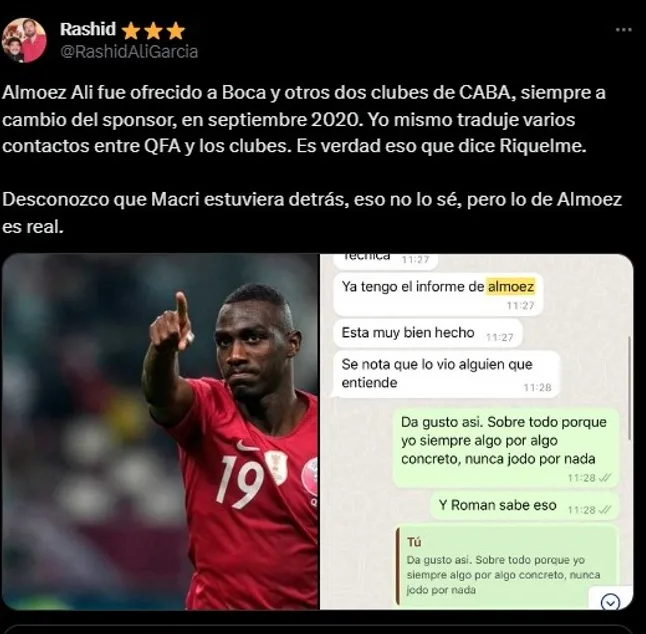 Unas horas después de la declaración, se pudo revelar que la versión contada por Riquelme es verdad y lo mismo fue confirmado por Rashid Ali Garcia en su cuenta de Twitter, periodista que tradujo varios contactos entre QFA y los clubes: “Almoez Ali fue ofrecido a Boca y otros dos clubes de CABA, siempre a cambio del sponsor, en septiembre 2020. Yo mismo traduje varios contactos entre QFA y los clubes. Es verdad eso que dice Riquelme. Desconozco que Macri estuviera detrás, eso no lo sé, pero lo de Almoez es real“.