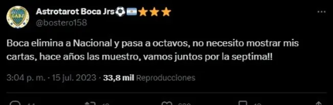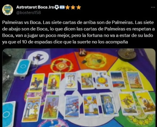 El protagonista en esta ocasión es Walter Lavalle, tarotista conocido en Twitter como Astrotarot, quien para la vuelta de Boca contra Palmeiras por Copa Libertadores tiró sus cartas y brindó su prediccion a los hinchas boquenses. En la ida, había asegurado que el cuadro azul y oro “sacarían un buen resultado”.
