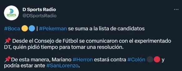 Sin trabajo en la actualidad, fue una de las opciones y con el paso del tiempo, las posibilidades fueron disminuyendo. Y en la tarde de este viernes, volvió a ubicarse en el radar de la institución. “Desde el Consejo de Fútbol se comunicaron con el experimentado DT, quién pidió tiempo para tomar una resolución“, informaron en D Sports Radio.