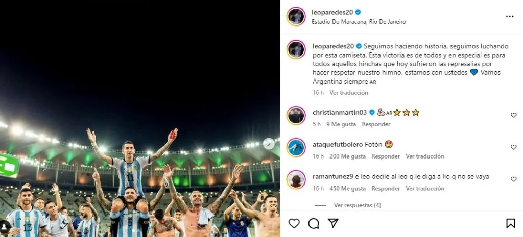 Además, concretado el triunfo, el jugador campeón del mundo dejó un mensaje en sus redes sociales: “Seguimos haciendo historia, seguimos luchando por esta camiseta. Esta victoria es de todos y en especial es para todos aquellos hinchas que hoy sufrieron las represalias por hacer respetar nuestro himno, estamos con ustedes. Vamos Argentina siempre”.