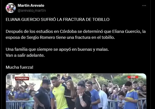 Eliana Guercio, mujer de Chiquito Romero, sufrió un accidente en la salida del hotel de Córdoba en dónde se hospeda Boca. ¿Qué pasó? La esposa del arquero Xeneize se dobló el tobillo mientras estaba en la puerta del lugar y tuvo que ser asistida por el mismo jugador azul y oro.