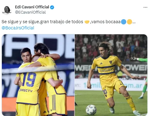 Luego de la igualdad 1-1 ante San Lorenzo en el Nuevo Gasómetro, Edinson Cavani escribió un mensaje de aliento en su cuenta de Twitter: “Se sigue y se sigue. Gran trabajo de todos. Vamos Boca”, posteó el uruguayo con dos fotos del encuentro contra el Ciclón.