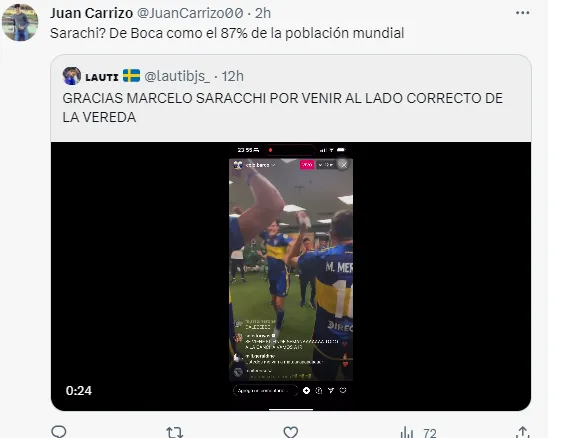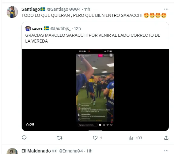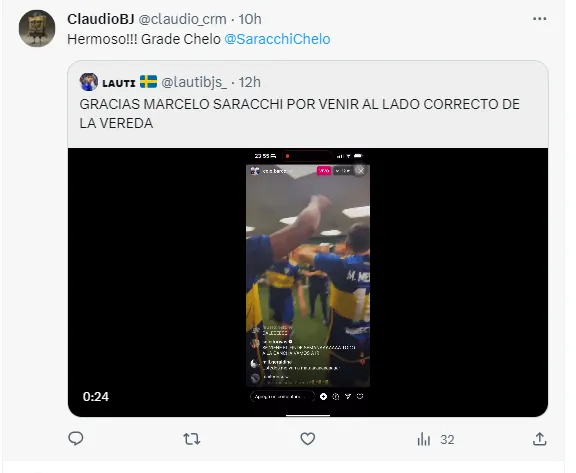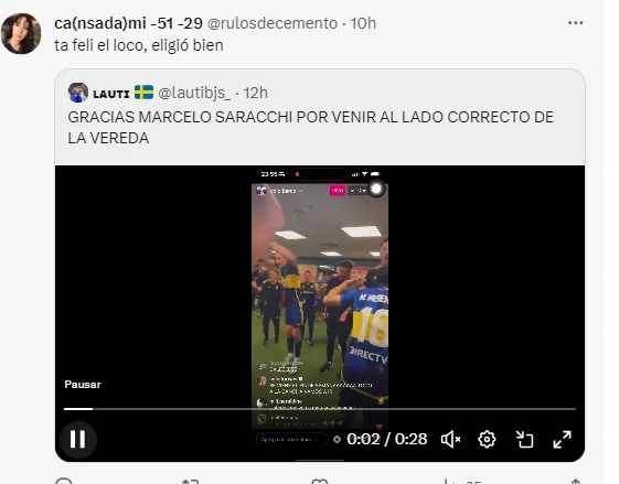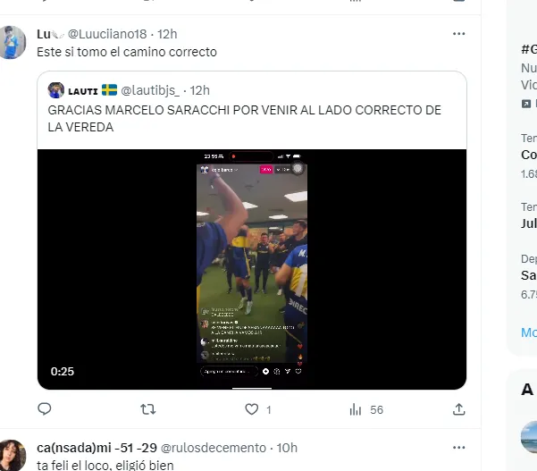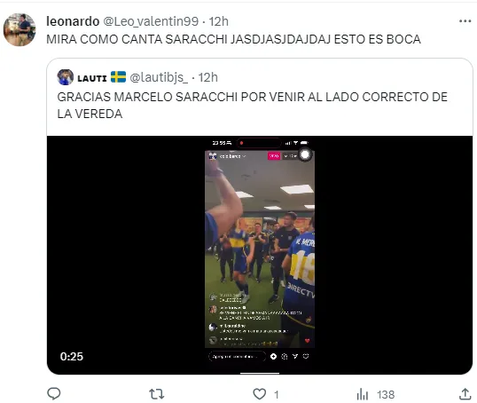 “Gracias Marcelo Saracchi por venir al lado correcto de la vereda”, fue el comentario de los hinchas al verlo gritando contra River en San Pablo. Además, se acordaron de Facundo Colidio y retrucaron: “Este sí tomó el camino correcto”.