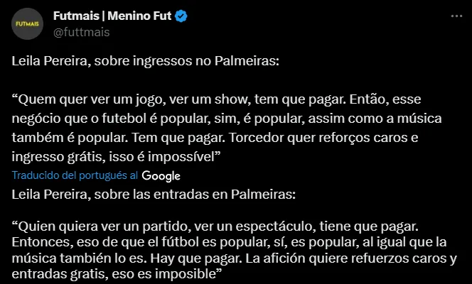 Otra cuestión que reclaman son las pocas entradas que consiguió el club para sus hinchas. Sin embargo, la protagonista no se quedó atrás y respondió a estas acusaciones: “Quien quiera ver un partido, ver un espectáculo, tiene que pagar. Entonces, eso de que el fútbol es popular, sí, es popular, al igual que la música también lo es. Y también hay que pagar. La afición quiere refuerzos caros y entradas gratis. Eso es imposible“.