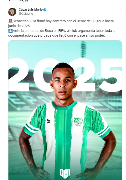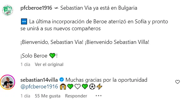 A través de su cuenta de Instagram, el club de Bulgaria anunció: “Sebastián Villa ya está en Bulgaria. La última incorporación de Beroe atterizó en Sofía y prontó se unirá a sus nuevos compañeros. ¡Bienvenido, Sebastián Villa”. El colombiano comentó el posteo y respondió: “Muchas gracias por la oportunidad”.