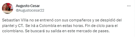 Minutos después, se conoció la decisión del colombiano. El periodista Augusto César reveló que Villa se despidió del plantel y el cuerpo técnico. Ya es un hecho: se irá a Colombia en estas horas. Mientras está en su país, Boca le buscará una salida para el próximo mercado de pases. No se pondrá nunca más la azul y oro.