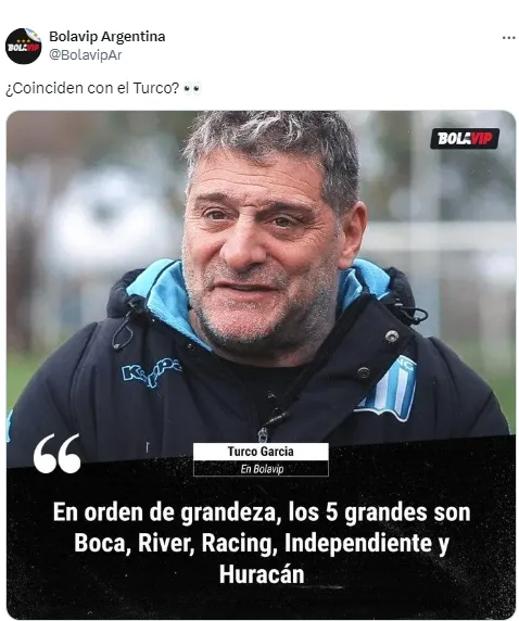 En su entrevista exclusiva con Bolavip, al Turco le hicieron elegir a los 5 grandes del fútbol argentino. Y dio que hablar tanto con el orden como con los integrantes: Boca, River, Racing, Independiente e Huracán. Marcando al Xeneize arriba de todos.