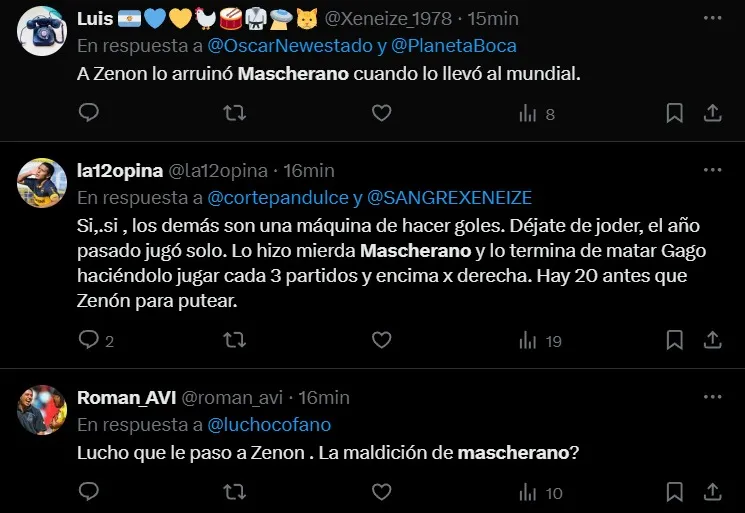 “A Zenón lo arruinó Mascherano”, escribió uno acusándolo directamente al DT de Inter Miami por el flojo rendimiento de Zenón. Otro habló de una maldición que tiene el ex jugador del Barcelona “Lucho, ¿qué le pasó a Zenón?, ¿la maldición de Mascherano?”, posteó. Lo cierto es que el jugador oriundo de Goya, perdió mucho terreno en la consideración del DT y hasta se puede entrever que perdería protagonismo durante el 2025, si continúa bajando su producción en la temporada.