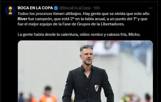 Sin embargo, los hinchas de River no fueron los únicos que se hicieron presentes en las redes sociales. Los de Boca también aparecieron y, a modo de burla, piden que el entrenador se quede en su cargo con el hashtag #NoTeVayasMicho.