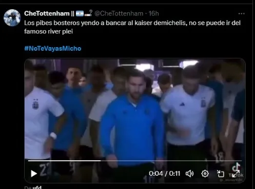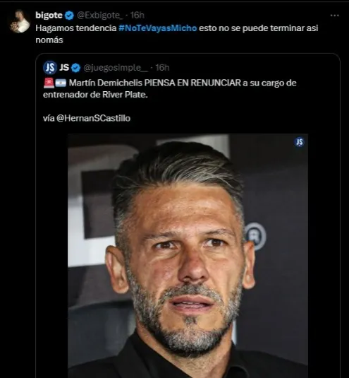 Sin embargo, los hinchas de River no fueron los únicos que se hicieron presentes en las redes sociales. Los de Boca también aparecieron y, a modo de burla, piden que el entrenador se quede en su cargo con el hashtag #NoTeVayasMicho.