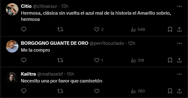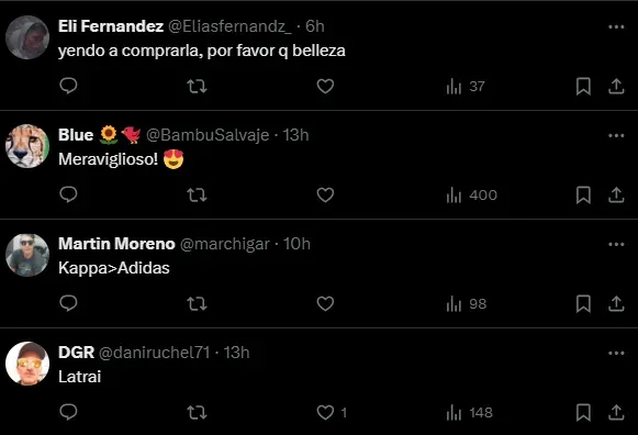 En la red social de X (Twitter), los simpatizantes del Único Grande se expresaron y dejaron sus comentarios. “Una preciosura“, marcó el usuario @palermismo, quien fue uno de los primeros en darse cuenta de la próxima casaca que saldrá a la venta del equipo de Italia. Al igual que él, otros tantos demostraron que, ni bien salga a la venta, irán a buscarla.