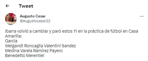El equipo que probó Ibarra en el entrenamiento matutino de este jueves: Javier García; Marcelo Weigandt, Facundo Roncaglia, Nicolás Valentini, Agustín Sandez; Cristian Medina, Alan Varela, Juan Ramírez; Martín Payero; Miguel Merentiel y Darío Benedetto.