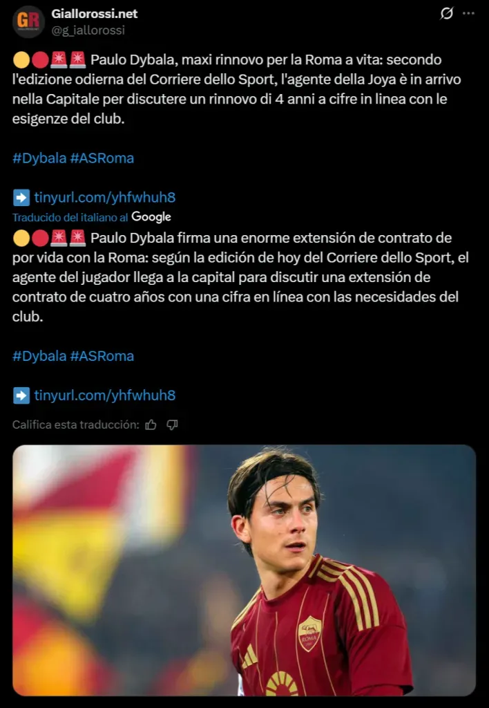 Desde el Corriere dello Sport y la página partidaria Giallo Rossi, informan que el agente de La Joya está trabajando con la Roma para la extensión del vínculo del jugador. La idea del conjunto de la capital es renovarle el contrato por cuatro temporadas más, en una suerte de compromiso “de por vida” con la Loba.