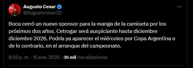 Según reveló el periodista Augusto César, Boca llegó a un acuerdo con Cetrogar, marca de electrodomésticos. Y el logo de la marca aparecerá en la manga de la camiseta del Xeneize.