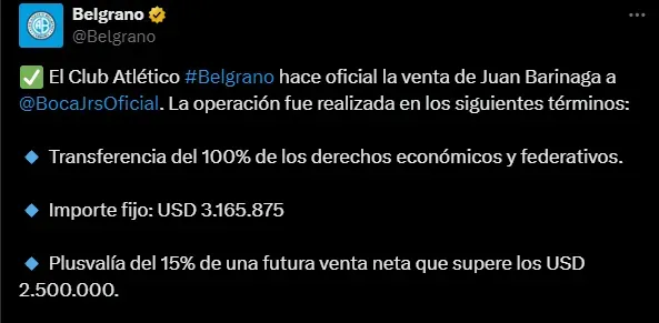 Desde la cuenta oficial de Belgrano de Córdoba, dieron a conocer que la transferencia se hizo por el 100% de los derechos económicos y federativos de Barinaga. Además, la cifra que invirtió el Consejo de Fútbol por el defensor fue exactamente de 3.165.875 millones de dólares. Este monto es aún mayor que el que se había dado a conocer cuando se oficializó su llegada.