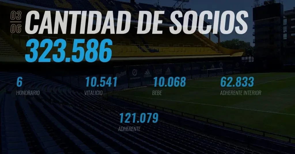 Según el relevamiento del ente regulador del fútbol argentino, el conjunto de la Ribera en el último año tuvo 323.586 socios. Sin embargo, el cuadro azul y oro tiene una particularidad: se discrimina según el tipo de socio que tiene el club, incluyendo Vitalicios, Adherentes, Activos e Internacionales entre otras categorías.