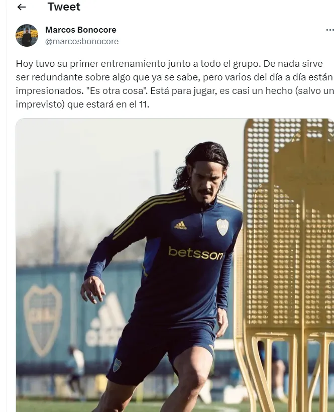 Fue el periodista Marcos Bonocore quien reveló que no paran de llover elogios para con el uruguayo. “Hoy tuvo su primer entrenamiento junto a todo el grupo. De nada sirve ser redundante sobre algo que ya se sabe, pero varios del día a día están impresionados”.