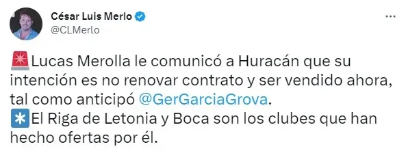 Según indicó el periodista Germán García Grova, “Lucas Merolla le comunicó a Huracán que su intención es no renovar contrato y ser vendido ahora. El Riga de Letonia y Boca son los clubes que han hecho ofertas por él”.