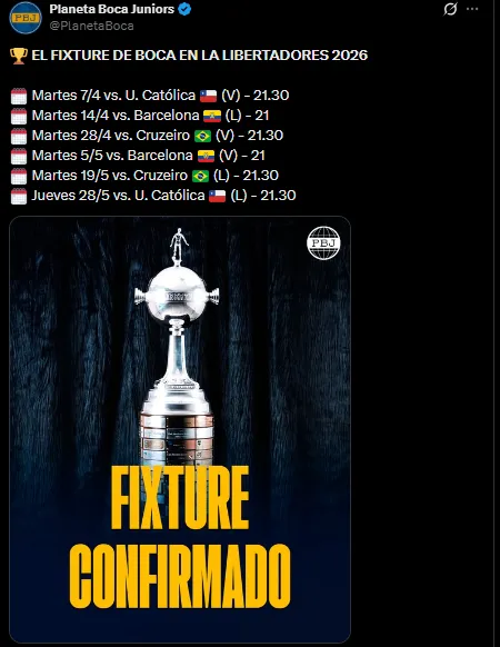 Boca ya conoció a sus rivales en la Copa Libertadores 2026. En el transcurso de este viernes 20 de marzo, el equipo supo exactamente en qué días y horarios disputará cada partido. Junto con el Torneo Apertura y la Copa Argentina se vendrá un trajín bastante importante para los dirigidos por Claudio Úbeda.