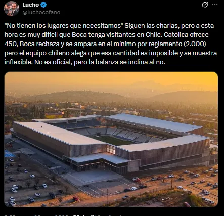 Sin embargo, pese a que muchos hinchas del Xeneize tenían planeado viajar a alentar al equipo, una mala noticia llegó desde Chile. Lo cierto es que el equipo local pretende darle a Boca solamente 450 entradas, un número insólitamente bajo para los aforos que suele tener el Xeneize.