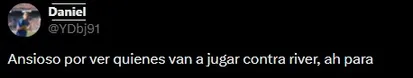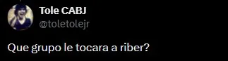 La ausencia del Millonario en la máxima cita continental fue el motivo de ironías y comentarios cargados de chicana. “¿Qué grupo le tocará?” o “Ansioso por ver quiénes van a jugar contra River… ah no pará”, fueron algunas de las respuestas que aparecieron en las redes.