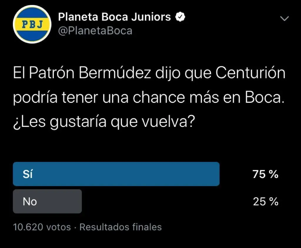 De más de 10 mil votantes, los resultados fueron más que claros: el 75% está de acuerdo con que Centurión regrese y forme parte del plantel a pesar de los problemas que tuvo mientras se encontraba en el club. Solo el 25% restante se mostró en contra de su regreso. Y vos, ¿qué opinás?