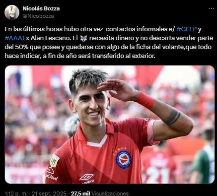 Se trata de Alan Lescano, hoy volante ofensivo de Argentinos Juniors. Pero ahora, hay una chance clara que podría facilitar su llegada pensando en el próximo año. Según reveló el periodista Nicolás Bozza, Gimnasia y Esgrima La Plata conserva un porcentaje de la ficha y podría vender una porcentaje debido a que necesita el dinero.