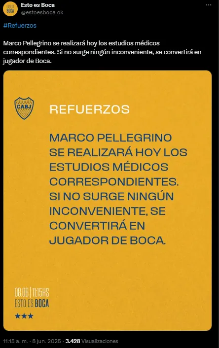 La cuenta oficial “Esto es Boca” confirmó que Marco Pellegrino se hace los estudios médicos en este domingo y que “si no surge ningún inconveniente“, será refuerzo del club. Esperan poder presentarlo durante el día y que viaje con el plantel a Miami esta misma noche.