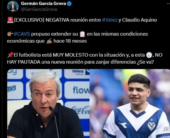 Según reveló el periodista Germán García Grova, Vélez y Aquino tuvieron una reunión negativa para resolver su renovación de contrato. Y de momento, la extensión de su vínculo que finaliza en diciembre de este 2024 no está resuelta.