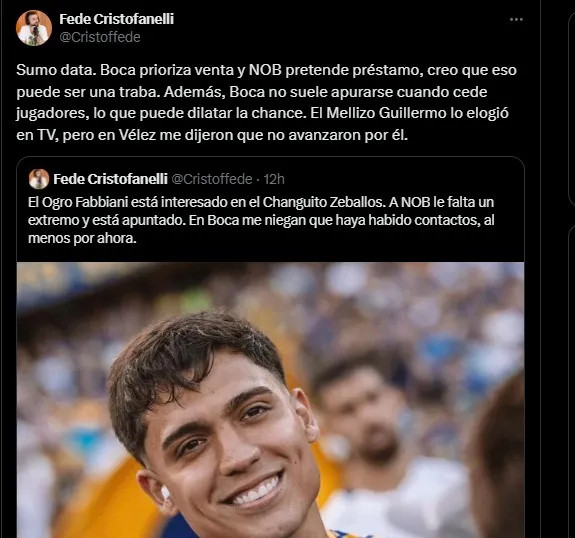 El periodista Federico Cristofanelli reveló que el Ogro Fabbiani (DT de Newell´s), está interesado en llevar a su equipo al Chango Zeballos. Esto, debido a que el equipo rosarino busca un extremo y el jugador de Boca es el apuntado.