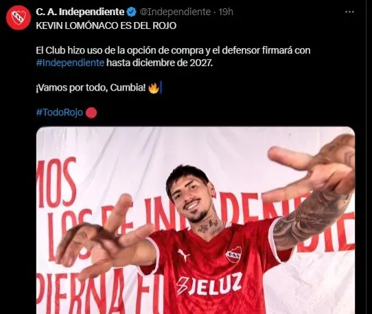 Sin embargo, a partir de una publicación oficial del cuadro Rojo, se reveló que Independiente finalmente ejecutó la cláusula y compró el pase de Lomónaco. Y ahora firmará contrato con el equipo de Avellaneda hasta diciembre del 2027.