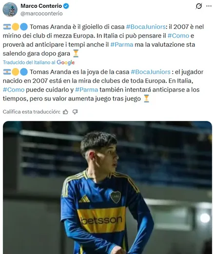 El impacto del mediocampista no pasó desapercibido fuera del fútbol argentino. Según informó el periodista Marco Conterio, tanto Como 1907 como Parma, dos clubes de la máxima categoría del fútbol italiano, siguen de cerca sus actuaciones y lo tienen en carpeta de cara al futuro.