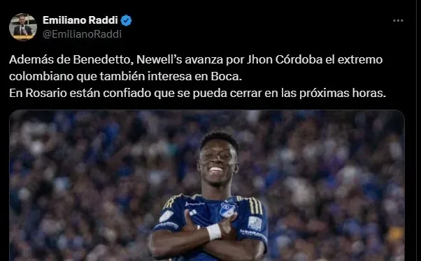 Y así lo informó el periodista Emiliano Raddi para Planeta Boca Juniors: “Además de Benedetto, Newell’s avanza por Jhon Córdoba el extremo colombiano que también interesa en Boca. En Rosario están confiados que se pueda cerrar en las próximas horas”.