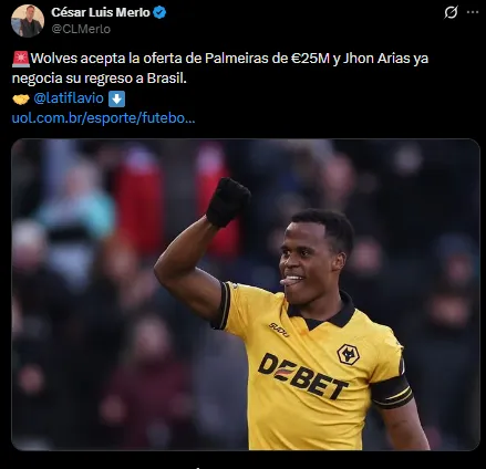 Según reveló el periodista César Merlo, el Verdao llegó a un acuerdo con el Wolverhampton para adquirir la ficha de Jhon Arias, exugador del Fluminense. El acuerdo sería por 25 millones de euros.