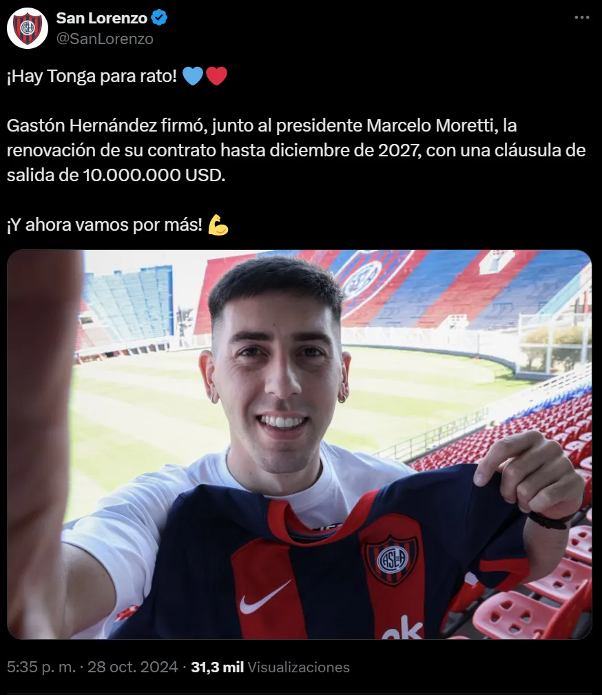 Pero a finales de octubre del 2024, el central renovó su vínculo con San Lorenzo hasta 2027, luego de un frustrado pase al fútbol griego. En ese sentido, el club le colocó una cláusula de 10 millones de dólares, según informó en sus redes oficiales. De esta manera, si Boca quiere a Hernández, deberá negociar con el Ciclón, algo que será complicado tras la salida de Russo, o pagar la cláusula de salida.
