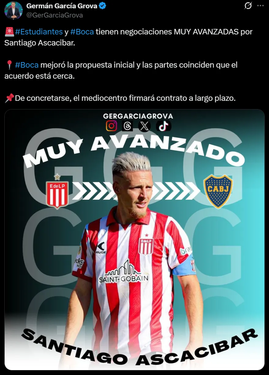 La fuente citada agregó que el Único Grande mejoró la propuesta inicial y llegaron a un entendimiento con el Pincha. Ambas partes reconocen que el acuerdo está cerca de cerrarse. En caso de que se concrete la operación, Ascacibar firmará un contrato a largo plazo con Boca.