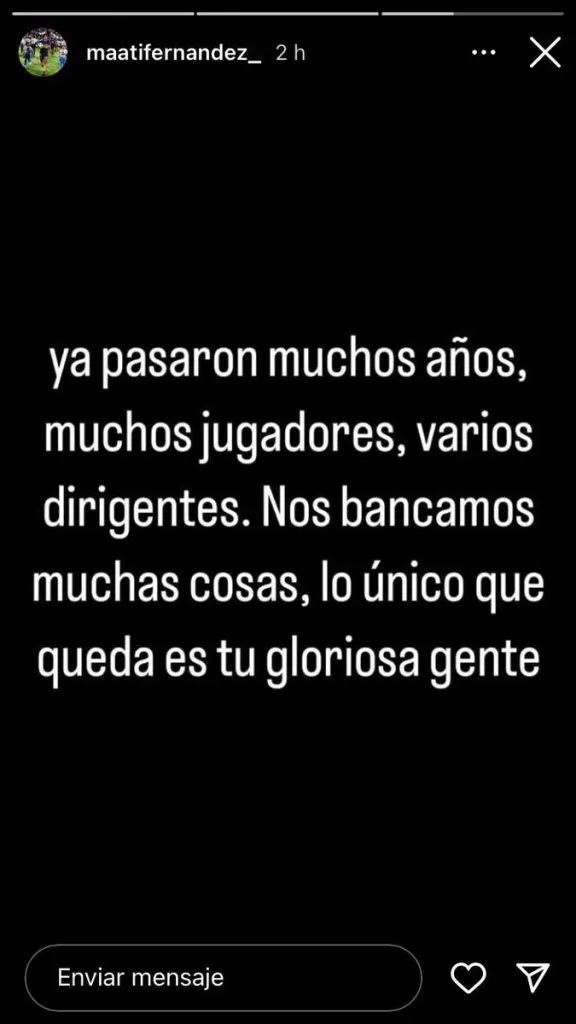 Y, en medio de este revuelo, quien apareció en las redes sociales fue el hermano del jugador: Matías Fernández. Y dejó un contundente mensaje: “Ya pasaron muchos años, muchos jugadores y varios dirigentes. Nos bancamos muchas cosas, lo único que queda es tu gloriosa gente”.