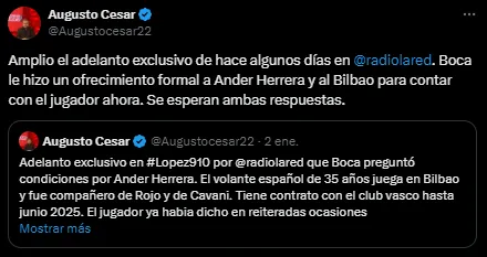 Según reveló el periodista Augusto César en Radio La Red, el Xeneize envió una propuesta al Athletic Club de Bilbao para sumar al volante ahora. El jugador había dicho en varias ocasiones que quería jugar en el club, y hoy ese deseo parece estar mucho más cerca.