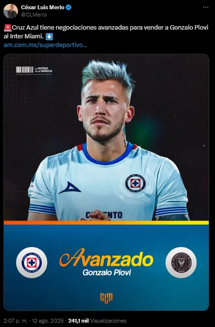 Gonzalo Piovi, lateral izquierdo de Cruz Azul, era uno de los apuntados por Pintita para sumar al plantel. Según reveló el periodista César Merlo, el zurdo ahora está muy cerca de llegar al Inter Miami.