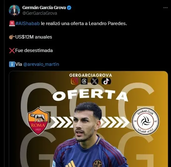 Según reveló el periodista Martín Arévalo, Leandro Paredes recibió una oferta por parte del Al Shabab de Arabia Saudita. Y la misma fue rechazada por el volante central de la Roma.