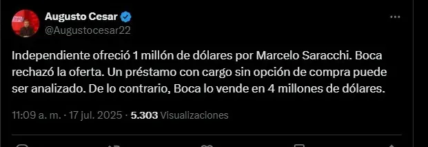 El periodista Augusto César dio detalles de la oferta de Independiente a Boca por Marcelo Saracchi. Y contó que se trató de un millón de dólares por su pase, la cual fue rechazada por el Xeneize tras ser considerada insuficiente.